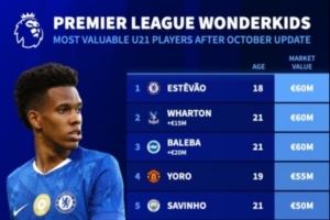 体育资讯10月18日讯 德转在北京时间本月17日更新英超球员身价,同时列出了英超U21球员身价榜,埃斯特旺、亚当-沃顿、巴莱巴三人6000万欧身价最高。
