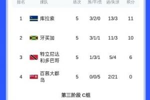 B组第五轮,特立尼达多巴哥1-1牙买加、库拉索7-0百慕大群岛,库拉索11分、牙买加10分前二,两队末轮正面交手争夺直通资格。